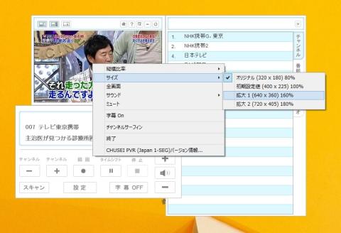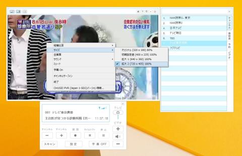 TV ビューアーに表示されているワンセグの画面を右クリックすると、画面サイズなどの設定をおこなうことができます。