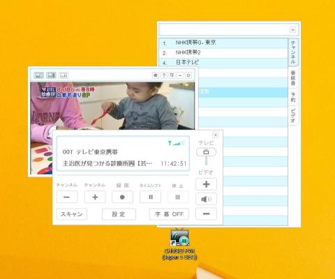 視聴ソフトは、ワンセグを視聴するTVビューア、チャンネルや番組表などを確認することができる機能ウィンドウ、チャンネルや音量の変更をおこなったり、ソフトウェアの設定を変更することができるコントロールパネルの 3 つのウィンドウで構成させています。