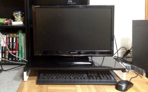 これを使うと、キーボードは使わない時にモニター下のスペースに仕舞って置けるので邪魔にならないし、埃も付かないのが助かります。
