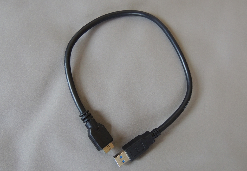 microUSB3.0→USB3.0のコネクタで、ケーブル長は30センチくらい。