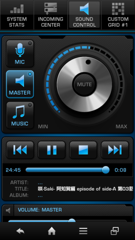 PCのシステム情報(CPUの使用状況、HDDの使用状況など)の確認も出来ますし、リモコンとして一番つかいたい、メディアプレイヤーの操作やボリューム操作も可能です。