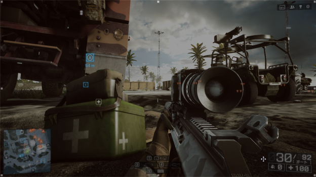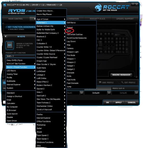 BF3の場合は既存マクロがあり色々面倒な設定をする手間がなくとても助かっています。私はBF3内でSpotをQキーに以前は設定していたのですがRyosに変えてからは画像で赤丸で囲んでいる通りにM1キーにマクロで設定しましたそうすることによっていちいちQキーを押さずにM1キーを押すことによってSpotが出来るようになりました。このように既存で設定できるのはとてもありがたいです。しかしいまだにBF4に対応していないので早く対応してもらいたいです。