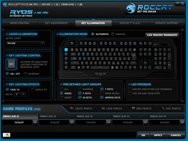 初期設定でクリックしたキーが何秒か光る設定になっていました。これをRyosのドライバーでうまく時間を設定できればLoLなどのRTOで光ってる間はスキルが使えるように設定しておけばすぐに次に攻撃できるタイミングがわかるのでとても便利ですね。イルミネーションをオフにしていたらG15では文字が見えずらかったのですが、Ryosはそんなことはなくはっきり見えるのでライトオフのときも大変見えやすいので助かります。