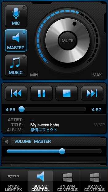 「SOUND CONTROL」タブではPC音量のコントロールを行うことができます。Alt+Tabで裏ページへいかずに音楽や音量を調節できる機能はとてもありがたいです。