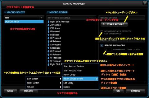 まずは1のマクロセットを作ります。次に2でマクロの名前を決めます。3でマクロのレコーディングを開始して同じキーで停止します。その後でウェイトを入れたり細かく設定できます。