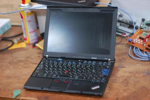 さて普通の人は、このような状態で・・・さらに強い振動の加わる歩行ロボットの上でパソコンを使うことに非常に違和感を感じるはずですが、筐体にマグネシウム合金を使っているX201ならではの芸当、この状態でも並以上の剛性があり、半田クラックで起動しなくなるなどといった問題は起きませんでした。