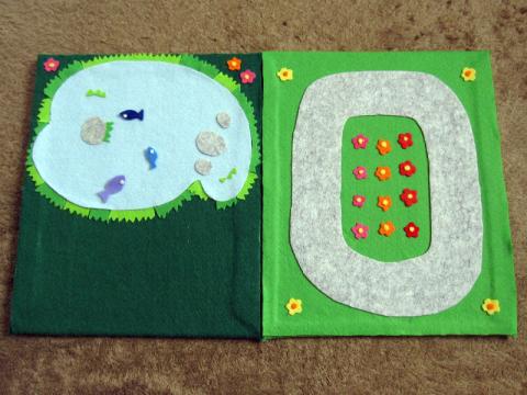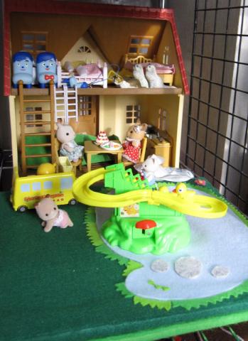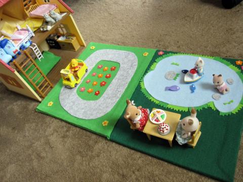 (2)端っこをちょっと残してフェルトの上に板を置き、両面テープをぐるりと貼ります(3)端っこを折り返して貼ります(4)もう一回両面テープを貼ってフェルトを貼って端を切ったらできあがり(5)あとは、場面をイメージして、好きに装飾しましょう(6)完成ー!そのままだと微妙感満載ですが、シルバニアさんを飾れば結構いい感じに見えるような気がしますwサイズを揃えておけば、使わない時は、重ねて棚にしまっておけます。