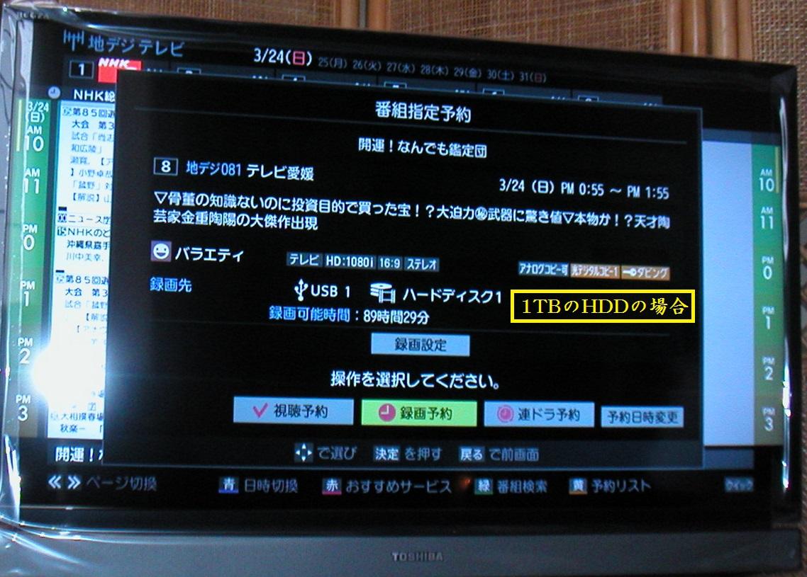 1TBなら地デジハイビジョンを89.5時間分録画できるようです。