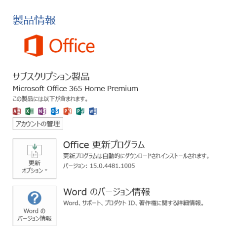 インストールすると下記のようなライセンス情報が表示されます。LyncやVisioは入っていないようです。
