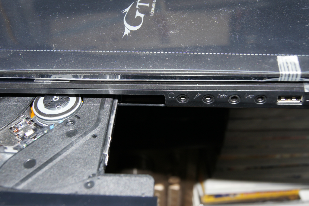 右側面には音声系の入出力とDVDドライブ、USB2.0が1ポート並びます。