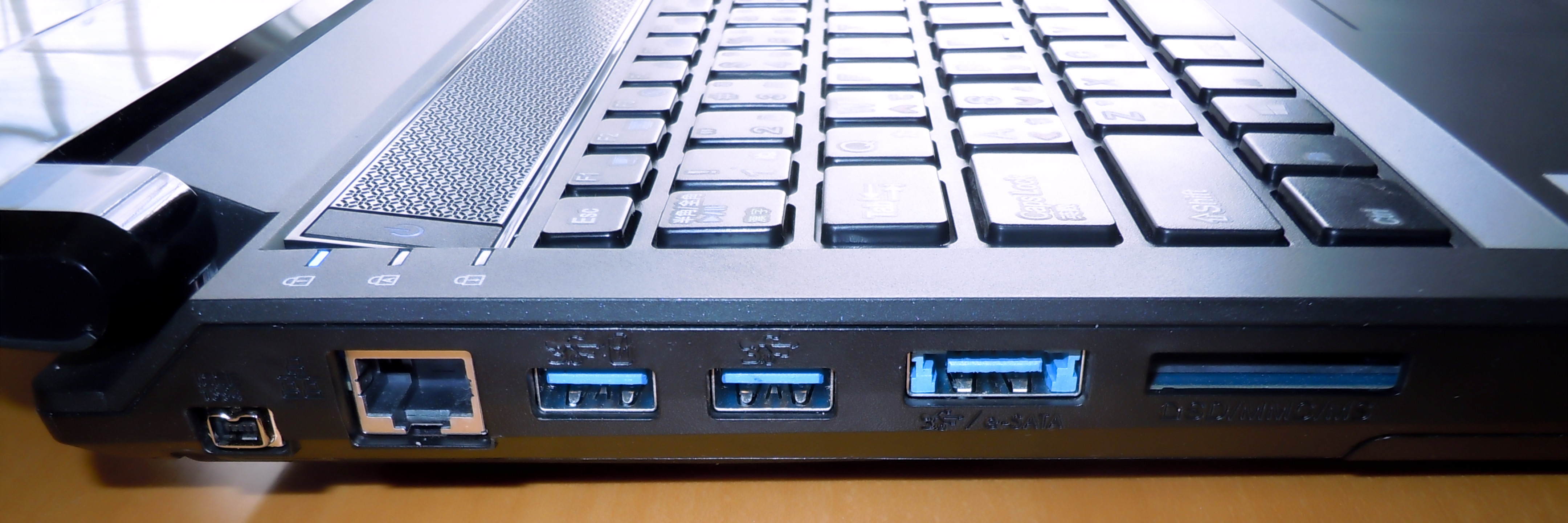 左からIEEE1394, RJ45優先LAN, USB3.0(SS) x2, USB3.0+eSATA兼用ポート, マルチカードリーダー (SD/SDHC, メモリースティック)。