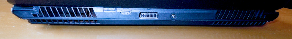 背面には排気口が左右に2つ、その間に ディスプレイポート、HDMI、DVI-I、電源ジャックがある。