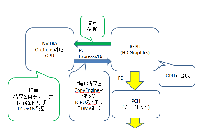という欠点があるが、Optimus ではアプリケーションによって外部GPUに描画させ、CopyEngineと呼ばれるGPU側のハードウェアで、内蔵GPUのメモリにDMA転送する方法で、通常通りIGPUがLCDやHDMI/DVIなどの出力をもつ PCHに転送する方法がとられる。