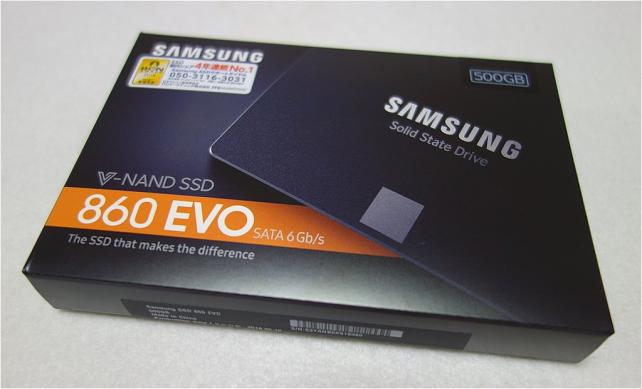 選んだのは、SAMSUNG 860 EVO 500GBモデル(MZ-76E500B/IT)。850 EVOの後継モデルでシーケンシャルリード550MB/s、シーケンシャルライト520MB/s、書き換え可能容量(TBW)は850 EVOよりも2倍に向上している。