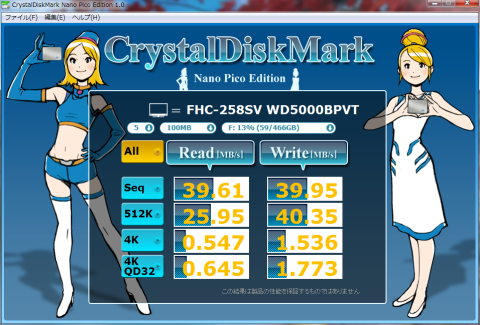 使用したHDDは WD5000BPVT。約40BM/sとUSB 2.0相応の結果です。