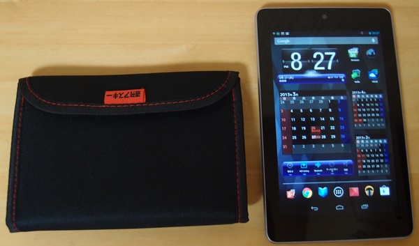ケースは長方形で、タブレットはそのままに、サイドのポケットに小物を入れられるつくり。