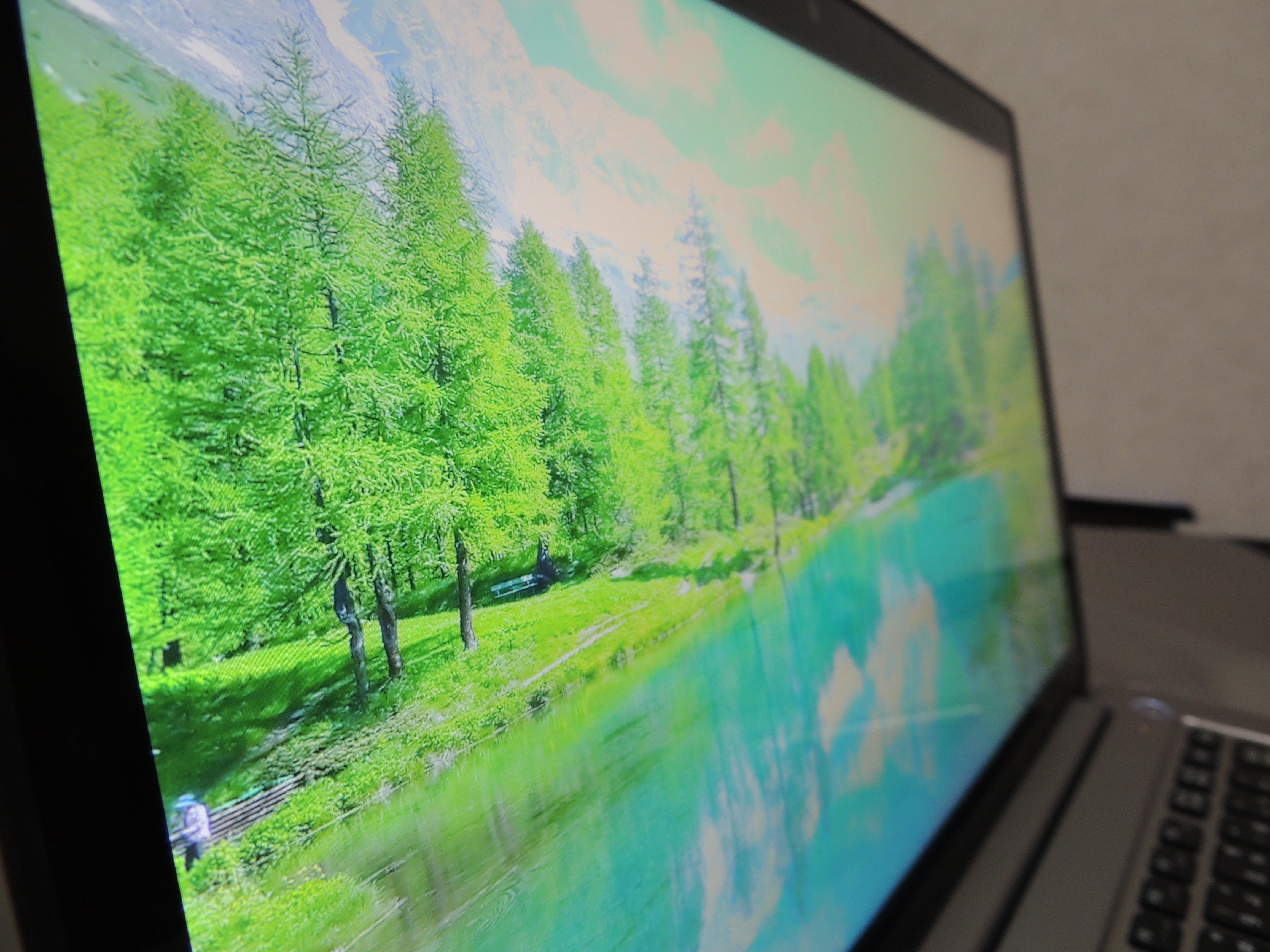 グレアパネルゆえの映り込みは避けられないものの、真横や真下から覗き込んでも全く色味が変わらない。