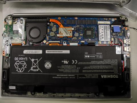 中を開けるとこんな感じ。ぱっと目に付くのはSSD。
