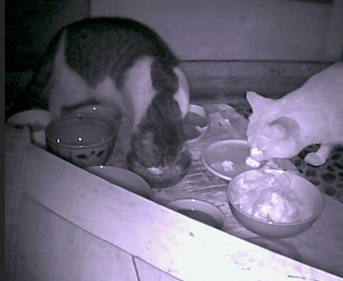 我家ではどらみ(♂)とももちゃんと呼んでいます。白く写ってるのは本当はトラ茶でどらみです。ももちゃんと親子なのか夫婦なのか,別々に来てもケンカになりません。互いに分け合って食べてます。