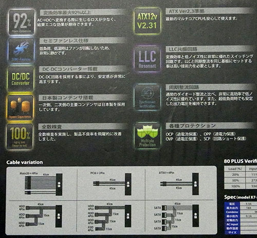まず決定的な差と共に特徴となるのが「セミファンレス」仕様。低負荷・低温時はファンが回らないという高効率電源ならではの仕様なのだが…今のところファンを回っているのを見たことが無い。最大で150Wくらいしか負荷をかけていないせいなのか、涼しい日のせいなのか、実は初期不良なのかと心配になるのだが。とにかく今のところまるでファンは回っていない。
