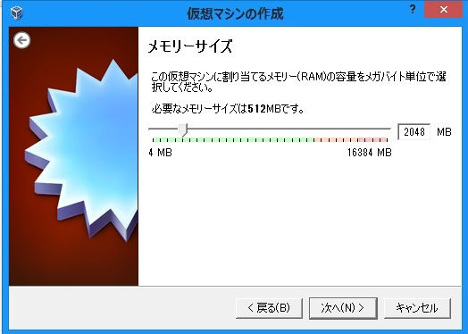 「メモリーサイズ」画面ではメモリーが十分有りますので、2048MB(2GB)を設定しました。