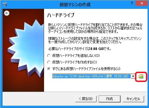 「ハードドライブ」画面では「すでにある仮想ハードドライブファイルを使用する(U)」を指定して、フォルダーの形をしたアイコンをクリックして、先ほど解答した「ubuntu-ja-12.04-desktop-i386.vhd」ファイルを選択し、「作成」ボタンをクリックすれば終了です。