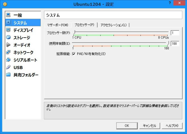 Ubuntuが使用するプロセッサー数の設定と使用率の上限設定が出来ますね。