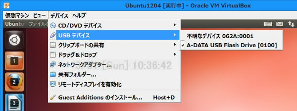 USBメモリーを刺したのですが、Ubuntuには出て来ませんでしたのでVirtualBoxのメニューの「デバイス」-「USBデバイス」で刺したUSBメモリーを指定するとUbuntuで認識可能になりました。