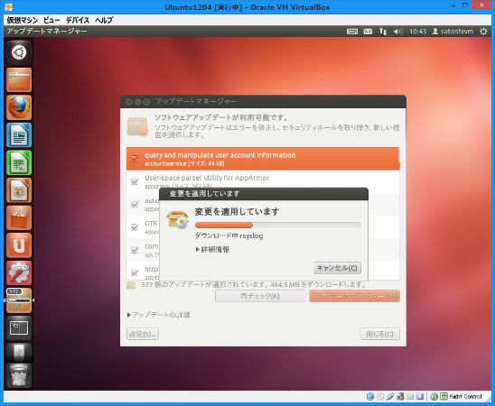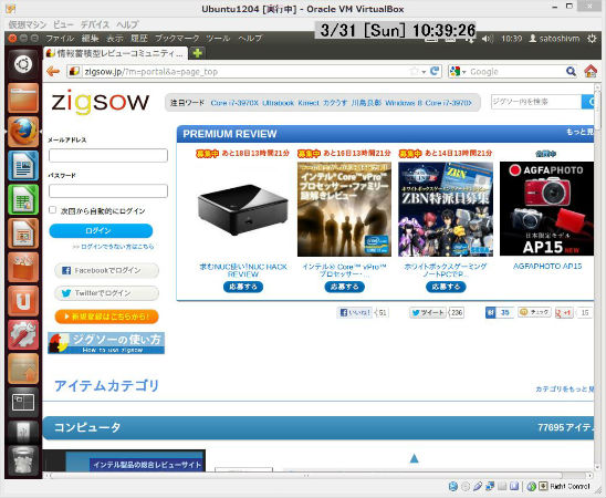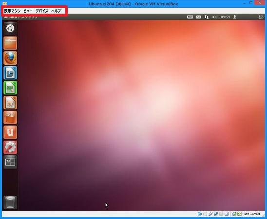 お馴染みのUbuntu12.04のデスクトップが現れましたが、 左上にVirtualBoxのメニューが有りますね。