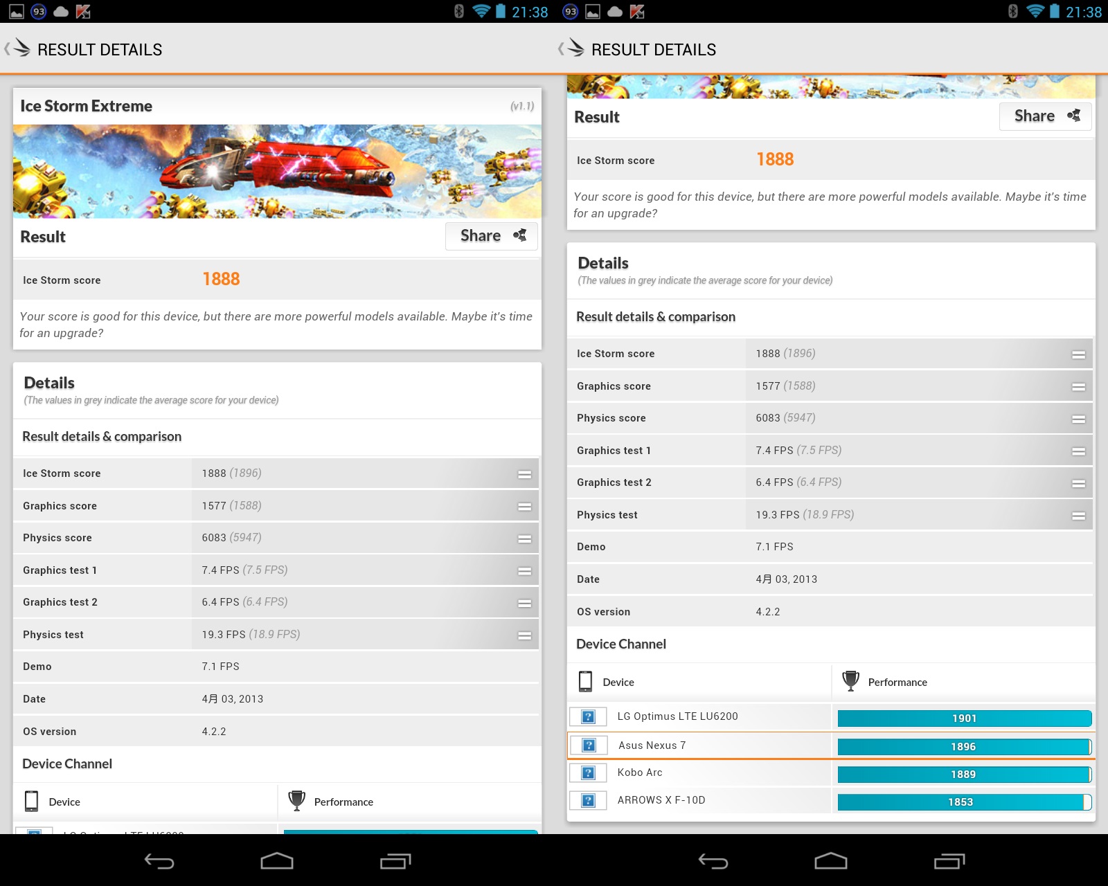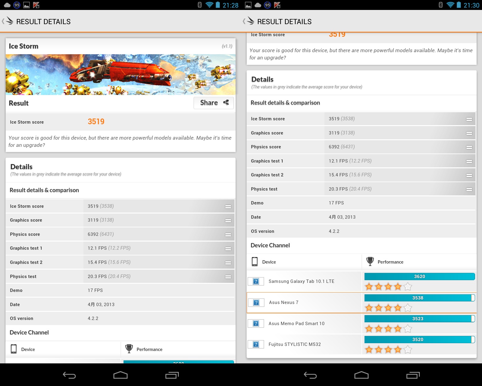 Nexus10もグラフィックススコアが低いとのことなので、そもそもTegra3と3DMarkとの相性が悪い気もしていますが、結果的に次に買う端末はGalaxy S4と決めることができたのは幸いです。