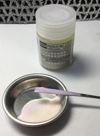 塗料皿に採ってみました。パールの粒子やベースの色が良くわかります。