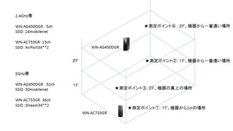 2.4GHz帯では、WN-AC733GRの方が、電波の強さとエリアの広さが優秀な結果となりました。