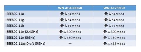 『11ac技術』対応機器では、WN-AC733GRの方が、WN-AG450DGRに比べて10%程度の転送スピードUPが確認できます。