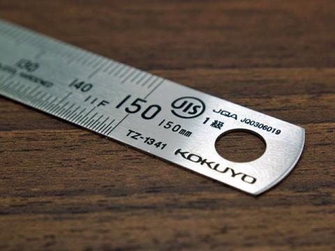 15cmの定規は非常に携帯性が良く、小物の寸法を測るのにちょうどいいサイズなのですが、私が最も重要と感じているのは、端から測れることです。よくある樹脂製の定規だと端から数ミリ入ったところから目盛りが入っている事が多く、止むなくそこを含めて測った場合あとでその分をマイナスしなければならないといった不便を感じる事が多々あります。