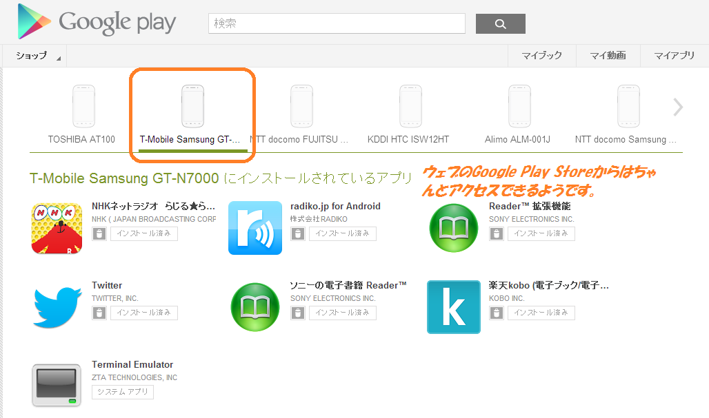 ちなみに Google Play Store は T-Mobile Samsung GT-N7000として見えてます。