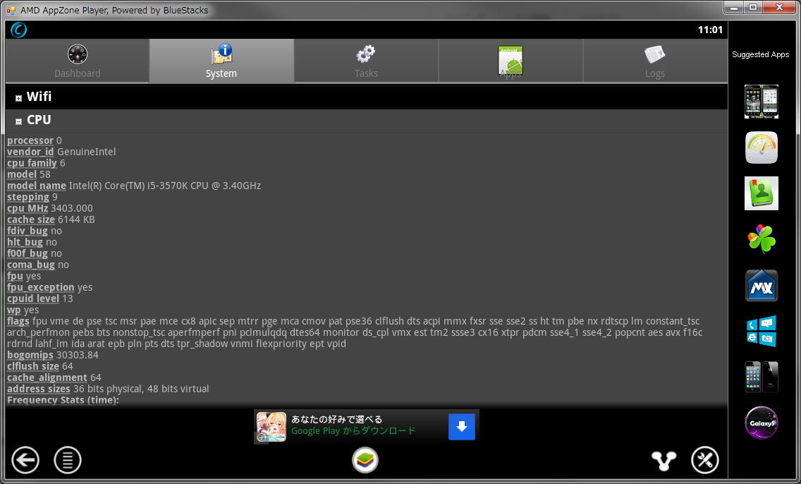 BlueStacks App Player がベースとなってて、別に APUやRADEON HDじゃなくっても起動するようですが、GPGPUを利用しているからか i5-3570Kにほとんど負荷をかけていません。