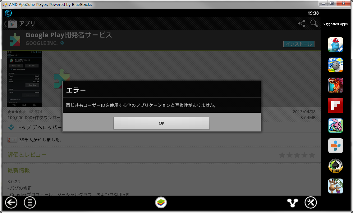 「同じ共有ユーザーIDを使用する他のアプリケーションと互換性がありません。」というメッセージによりインストール完了できません。
