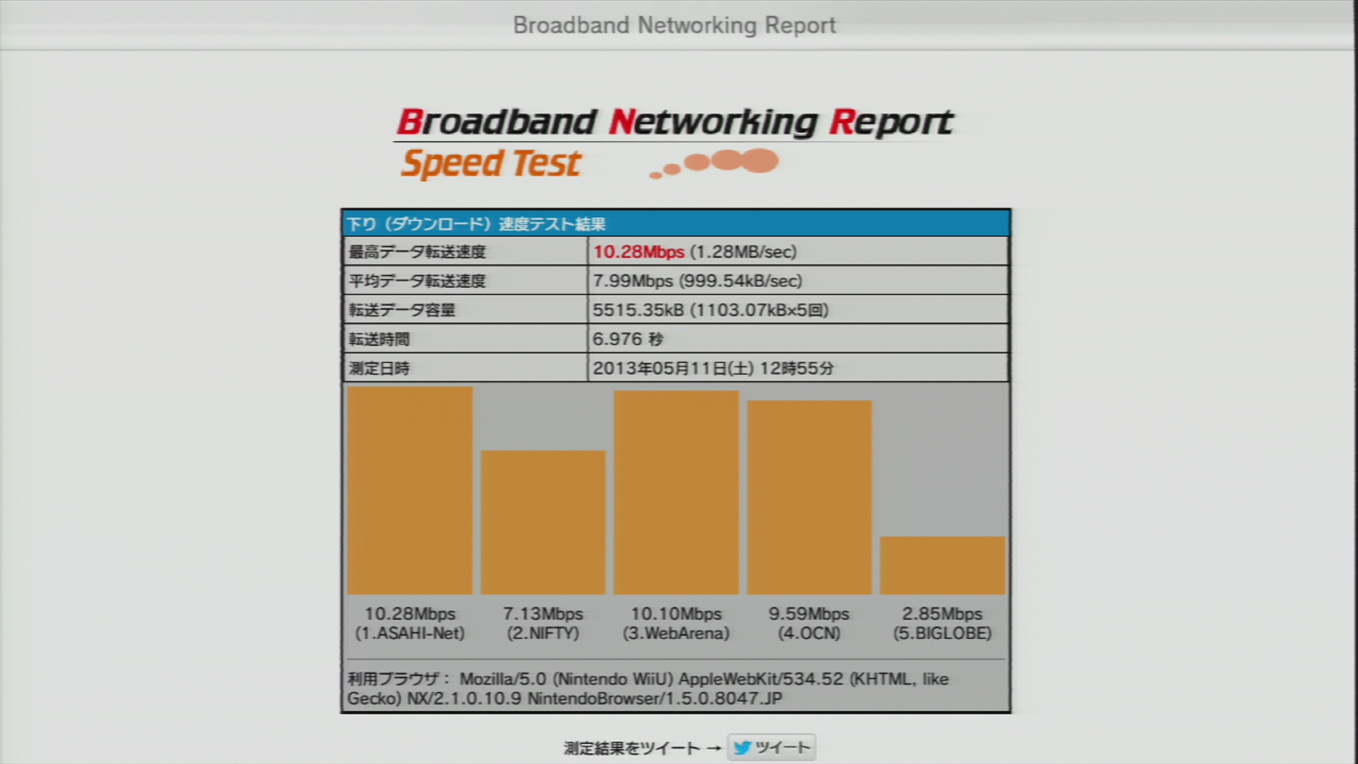 Wiiが6.8Mbps、WiiUが10.3Mbps。