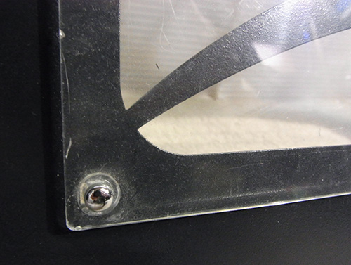 元の固定方法もチープで、上の写真でナットかリベットっぽく見えるのは銀メッキのプラスチック部品で、小さなタッピングネジがねじ込まれているだけだった。今回周囲8箇所の固定穴はそのまま流用するので、元のプラ板とだいたい同じサイズにして同じ場所にネジが通る穴を開けて、代わりのネジを通せばいい。むしろこれで失敗するようだったら私不器用すぎるだろう。