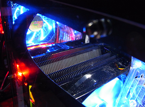 なんでこんなことしたかというと、本来収まらないサイズのCPUクーラーを収めるために、内側にあったプラ板を外側に固定してむりやり内部スペースを5mmほど増やしクーラーのヒートパイプを収めているというもうアホさ全開仕様。