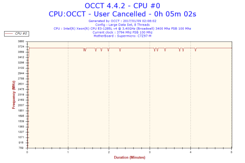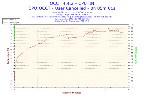 OCCTで5分負荷をかけてCPU温度変化を見てみる。自分のPCはケースファンの制御を無理やり電圧制御でセミファンレスにしているのでCPU温度が65度程度を超えるとファンがゆるゆると回転しだす。ちなみにケースファン以外のファンはセミファンレス電源の内蔵ファンだけなので温度が上がらなければ無音動作するというPCだ。マザーは水平設置になる。