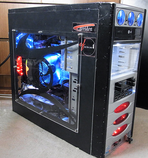 処分品1980円で購入した典型的な廉価ノンブランド品。全体的にベコベコと薄いケースだが、一般的配置のATXケースとしてギリギリの小さめなサイズ&光物が生かせる側面クリアパネルが特徴。