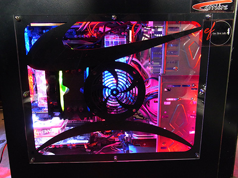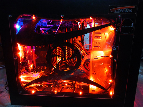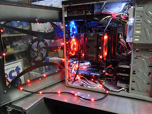 ご覧のとおり現在の状態は繁華街。元々メチャクチャで色もばらばらの光物を仕込みまくっていったので統一感も何も無い。X79環境だからとメモリクーラーは2個ぶち込んであるわ、派手さに定評のあるENERMAX製ファンや、ホワイトLEDテープを天板に這わせていたりと明るさだけは自慢できる。