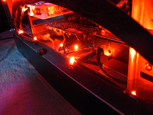 赤色という事でもし1個だったらかき消されてしまいそうだが、こいつは合計24個のLEDを備えているのでケースの外周部分から包むように照らしたので存在感抜群。さすがに白色LEDテープが照らしまくっているケース上部はおされ気味だが、十分な輝度だろう。
