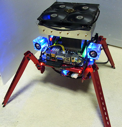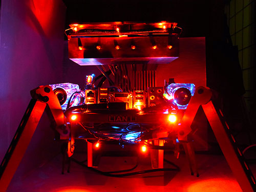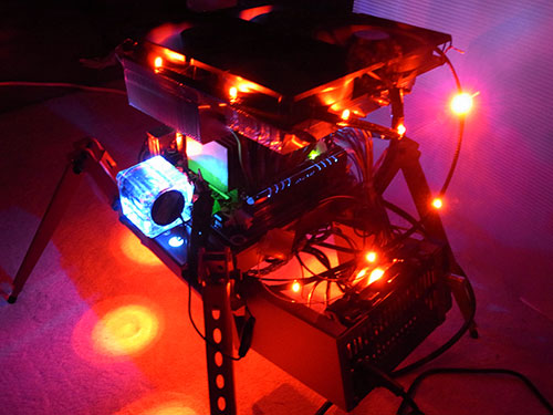 Lian-Li PC-T1Rという4本脚のオープンエアーケース(?)と巨大クーラーScytheスサノヲを組み合わせたネタPC。あまりに特殊な形状なので折り曲げ方が制限されるLEDテープで装飾するのは難しいのだが、今回のLEDケーブルならもうクリスマスツリーの如くぐるぐるまいてしまえる。実は上の写真で既に装着状態だ。