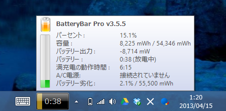 タスクバーに常駐し、バッテリーの状態をお知らせしてくれます。