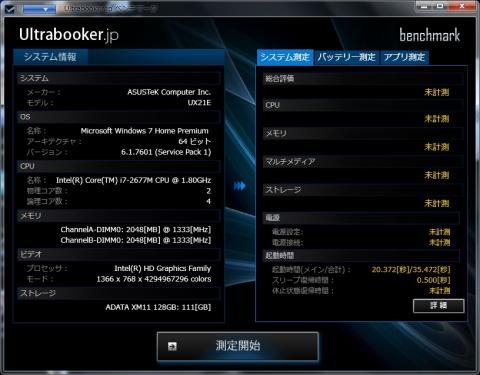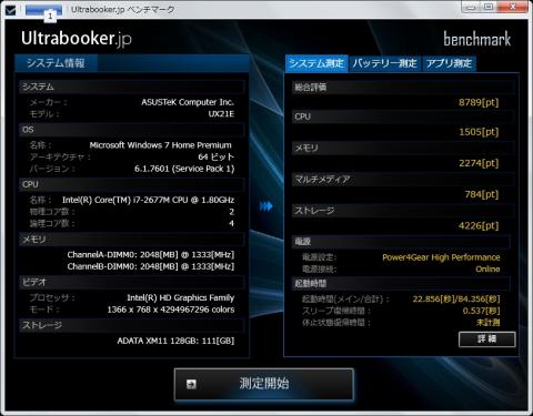 CPU、メモリ、マルチメディア、ストレージに対して、それぞれピーク時と指定したアプリケーション実行時における性能を測定し結果を WEB 上に表示することができます。