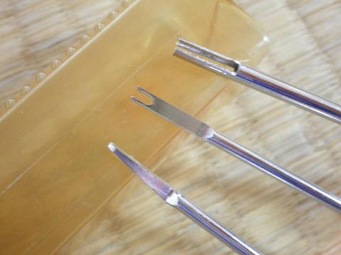 グラインダーで、ダイソー製ピンセットの先を削って返し外しを作ることも出来ますが、専門品以外では、ピンが折れたり、削った先が細くて柔らかくなっており折れると言ったことがままあり、100%再利用しなくてはならない現場では、使うことをためらいます