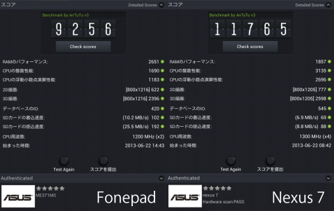 今度は左側が Fonepad™、右側が日本での発売(2012.09末)から酷使してきた Nexus 7 のベンチマークの結果です。
