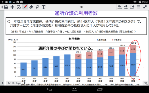 テキスト「通所介護の伸びが・・・」と赤ペンで「◯」を入れてみました。